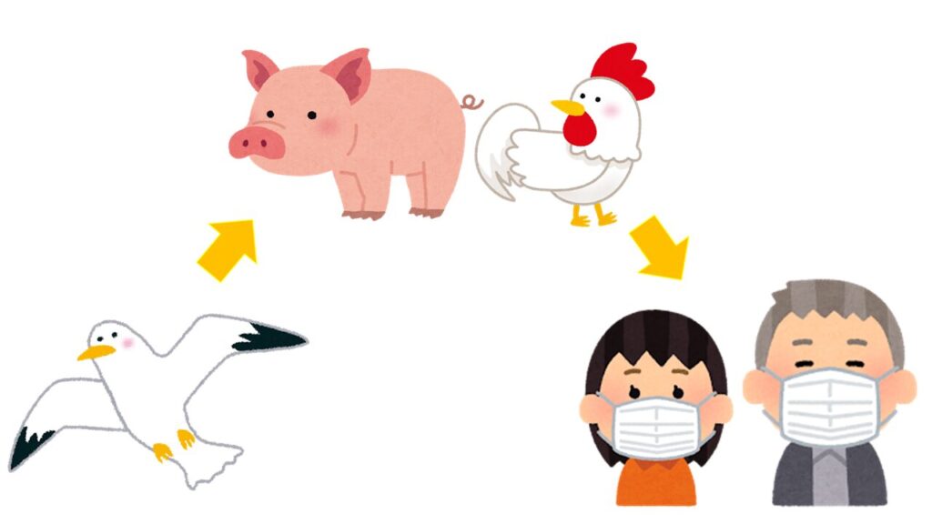 インフルエンザの始まりは古く、古代エジプトや古代ギリシャにも類似した感染症症状の記述が残されているそうです。インフルエンザウイルスは元々、野生の水鳥や渡り鳥が保有していました。それらの排泄物が水辺に放たれ、家畜として飼っている鳥類や豚などに感染し、動物の間で感染を起こしては変異を繰り返し、やがて人に感染しやすいウイルスとなって広がるようになりました。