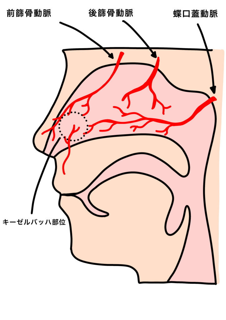 特に鼻の入り口近くの鼻中隔(右鼻と左鼻を分けている真ん中の仕切りの壁)はキーゼルバッハ部位と呼ばれ、粘膜の血管が豊富ですが、鼻の役割があるために鼻の入り口が感染や乾燥で荒れると粘膜が痛んで出血しやすく、「よくある」鼻血になるわけです。鼻をいじったりこすったりすると余計粘膜を痛めて鼻血が出やすくなります。また、脳梗塞後や心疾患で抗血小板薬、抗凝固薬を飲んでいる方は血が止まりにくいだけでなく傷の治りも悪いため出血を繰り返してしまいます。