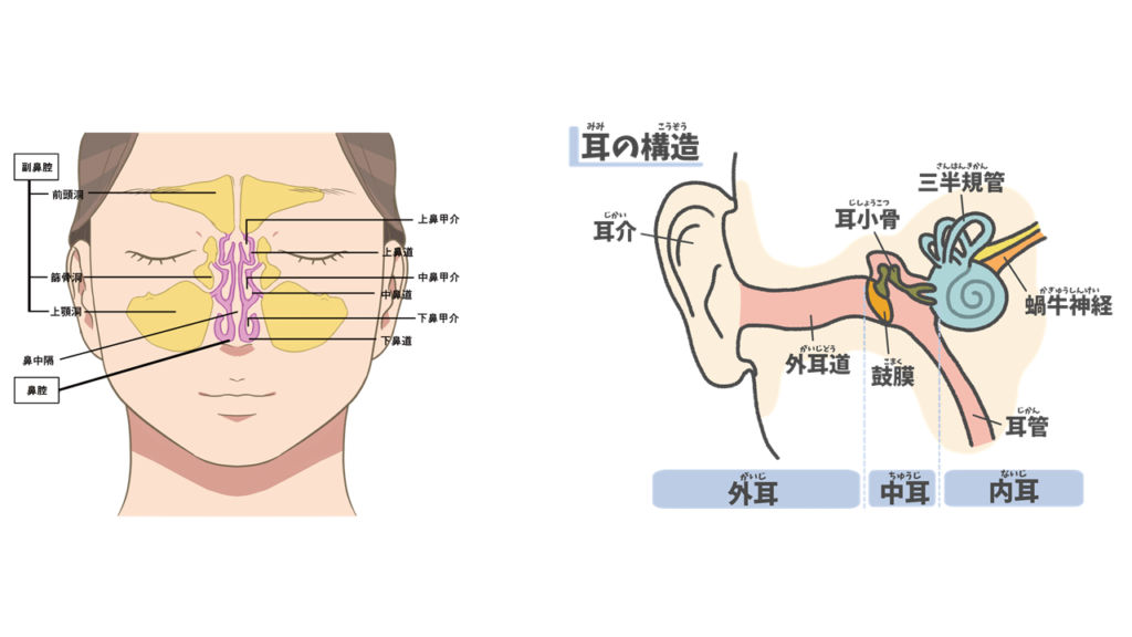 鼻の入り口を抑えながら鼻をかむと呼気の通路が狭くなり細いストローを吹いた時のように圧力が高くなり、多くの鼻汁が排出されすっきり感が高まります。主な呼気排出路は鼻孔ですが、圧が高くなると通常は閉じている鼻と耳をつなぐ耳管と呼ばれる管が押し広げられ、鼻水が送り込まれるだけでなく中耳に圧力がかかります。