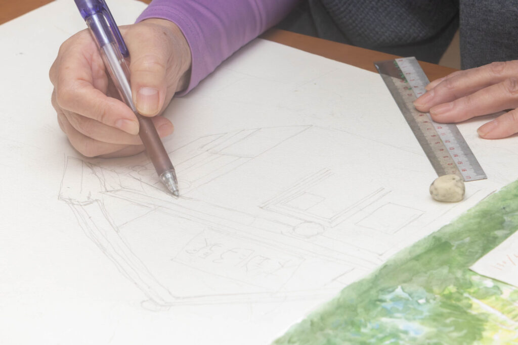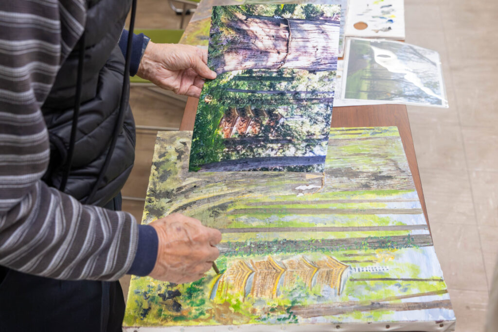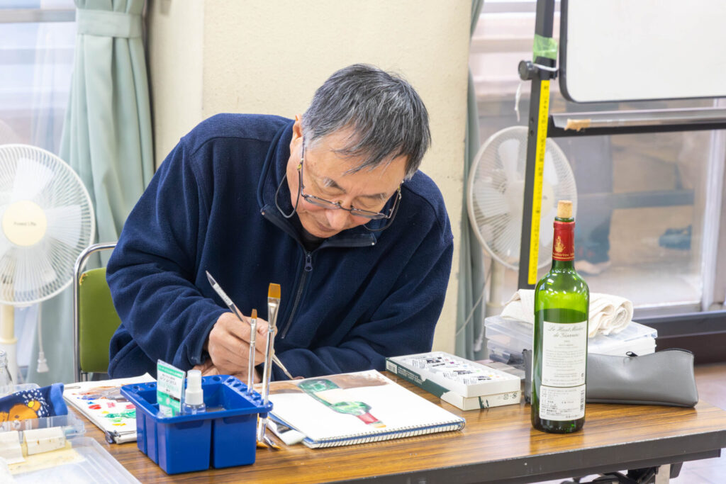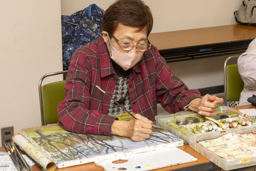 佐倉城址公園の風景画の続きに取り組む女性は、「学生時代、美術は5だったのよ」と、茶目っ気たっぷりに話し、慣れた手つきで素早く仕上げていきます。写生会から入会した2名の新会員も改めて紹介され、歓迎を受けるなか、制作に励んでいました。