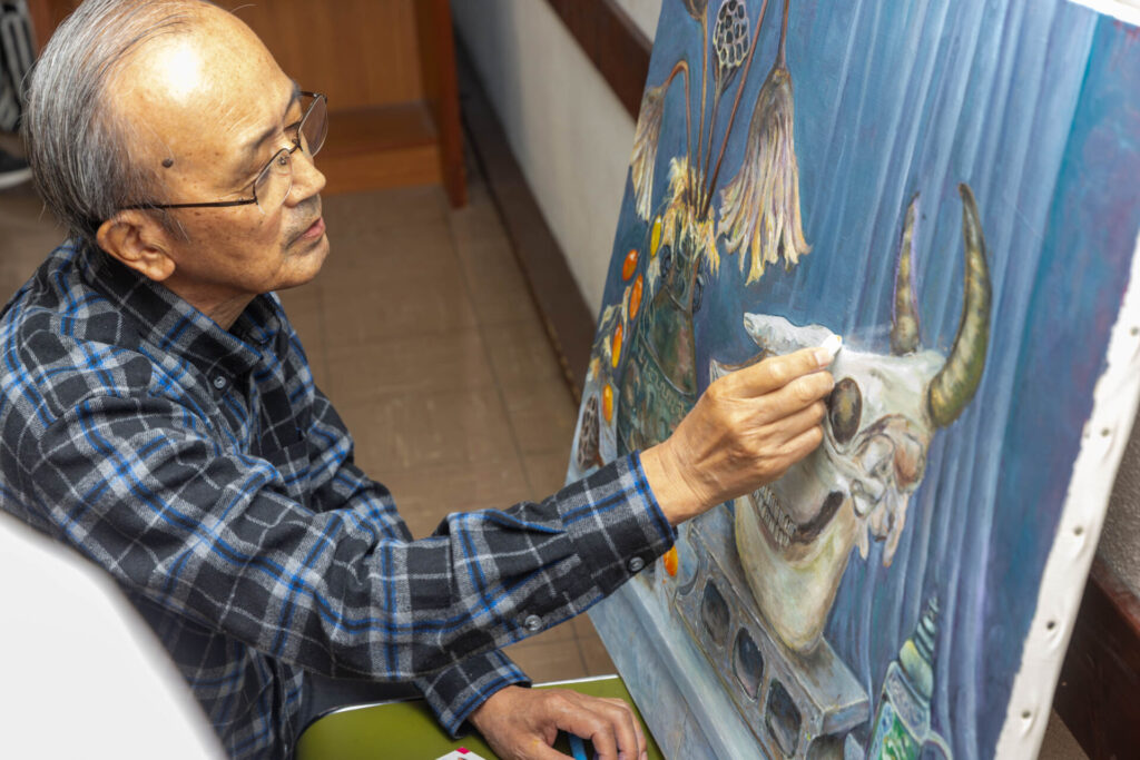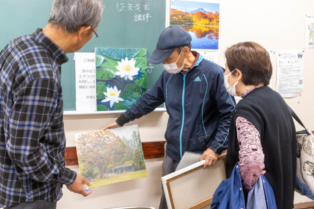 会について、どの会員も口を揃えるのが、「皆やさしくて、和気あいあい」。講師と会員たちが長年にわたり築いてきた雰囲気が魅力。全国規模の美術団体に所属し、県展などへの出品を目指す会員らを始め、油絵をゼロから学び始めた方や水彩が好きな方など、目標や趣向は様々ですが、絵が好きな人たちが集い、互いに高め合い、笑い合える仲間との時間が、継続の源です。