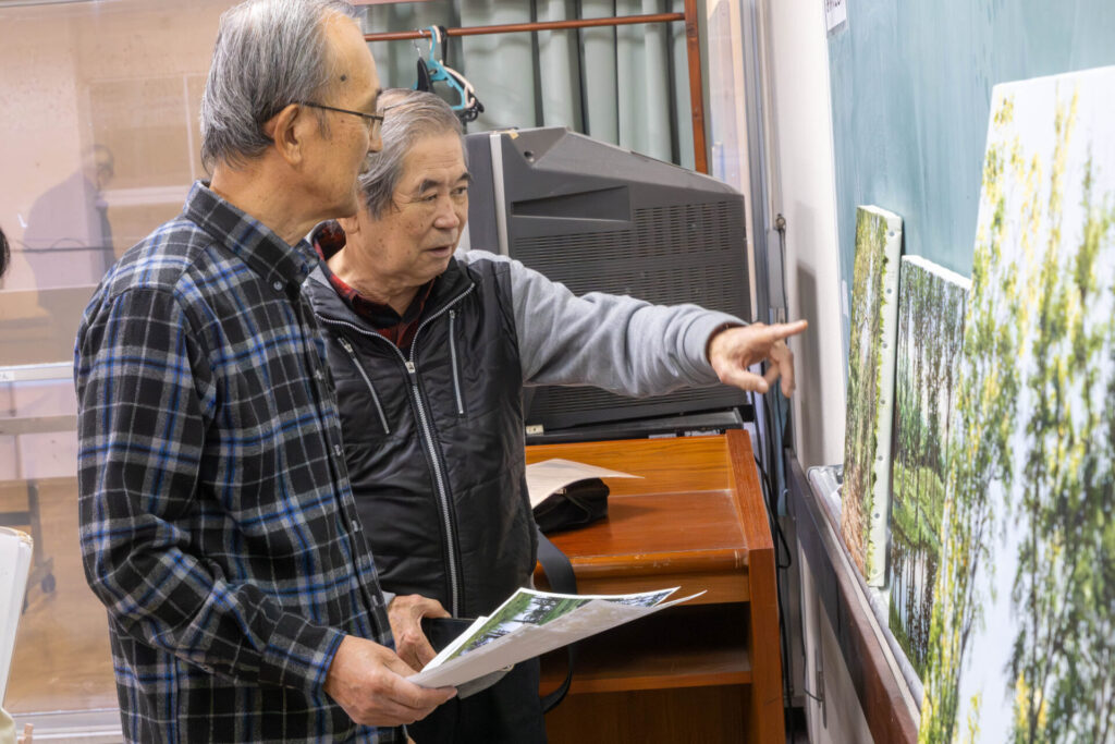 最後の講評では、木々に作品を立てかけるなどして、一つひとつ征矢先生が批評していきます。自分の作品だけでなく、会員それぞれの作品を食い入るように見つめ、講師の言葉に真剣に耳を傾ける会員たちの姿が印象的です。