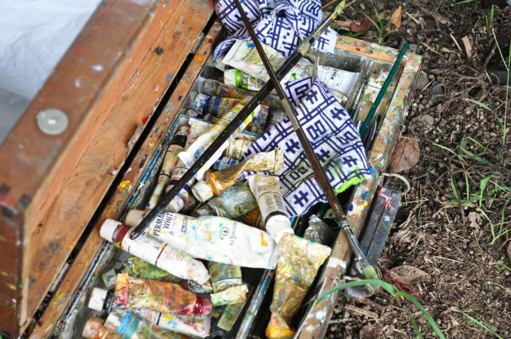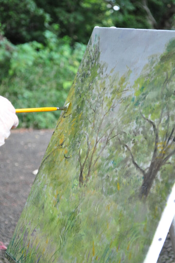 入会して約20年の男性は、自分の家に飾れる絵を描くことを信条としており、サイズは10号までに留めています。この日は、制作を目的に足を運んだ羽黒山の風景を10号で描いていました。