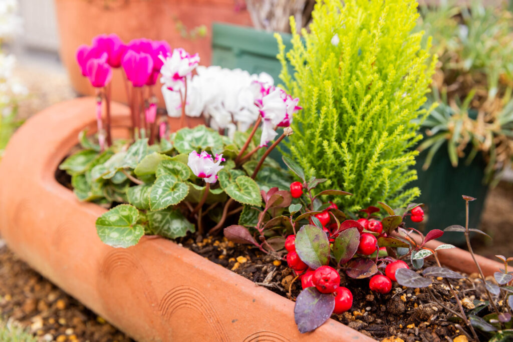 花の栽培は、ご主人が担い、手入れの行き届いた庭に、シクラメン、カーネーション、ラベンダーなどの花々や、ハボタンとヴィオラの寄せ植えが冬の庭を彩ります。