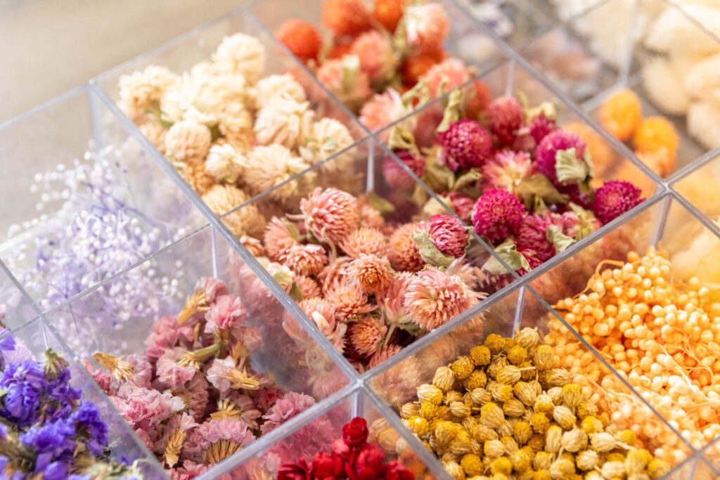 キャンドルに装飾する植物は、プリザーブドフラワーやドライフラワーを始め、木の実やドライフルーツなどを使用。自宅の庭で育てた花も活用しており、アジサイ、キク、ケイトウ、千日紅など、庭で開花した季節の花々を摘み取り、ウォールハンギングなどで乾燥させ、花材にしています。