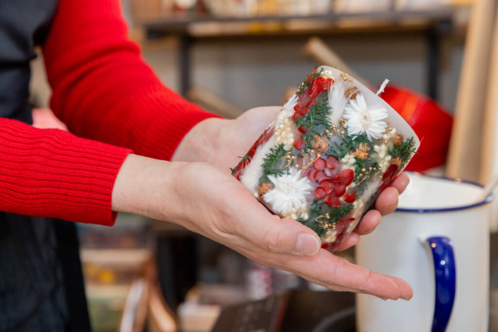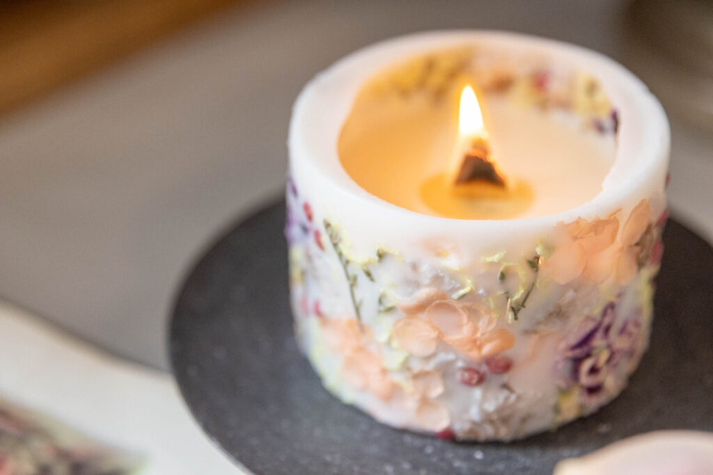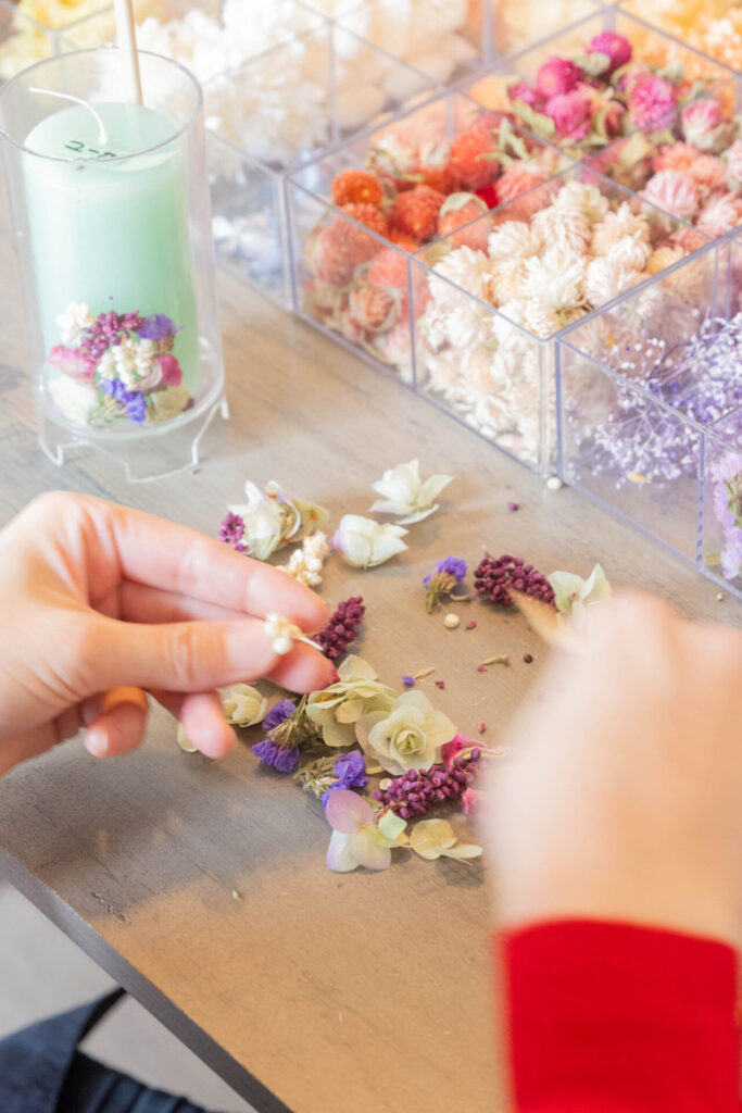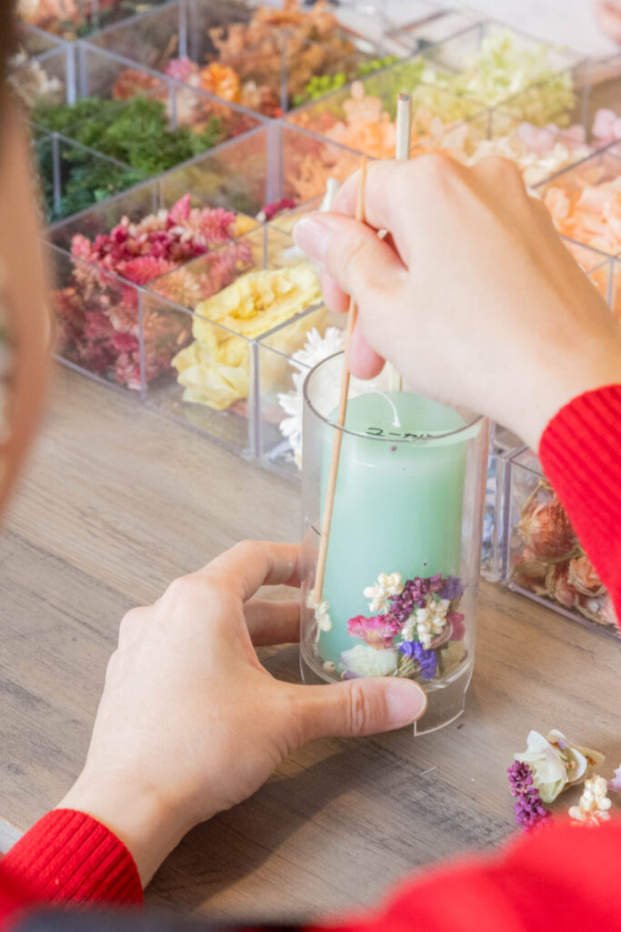 色とりどりの花々と植物の香りに包まれながら創作する時間や空間そのものが癒やしであり、世界に一つだけのオリジナルキャンドルの完成に達成感が溢れます。