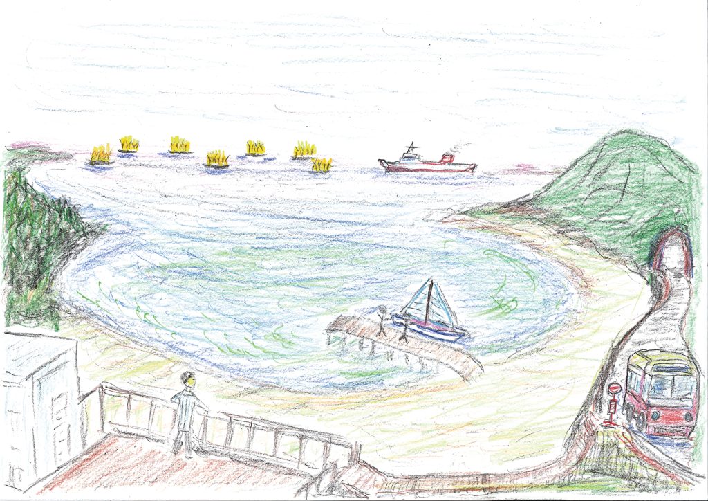 岬ゆきのバスに揺られて、僻地の病院まえに降り立つと、海峡にそった浜は、たそがれどきの凪(なぎ)となり、一面、茜色に染まった海を眺めていると、ラオシーは、なぜか“浦島伝説”に思いをはせてしまうのです。浦島さんは、船が難破して流されてきた琉球の少年を家で匿(かくま)って、再び琉球へ戻る船に乗せて帰してあげたのではないかしら。その返礼に浦島は、琉球の王宮に招かれます。琉球は海洋国家ですから、いろんな国との交易や外交のたびに華やかな酒宴が催され、浦島は、その聡明さと人柄が買われて、一生懸命、そのお役を務めたのでしょう。悠久の琉球時間ですから、浦島が故郷に戻ったときは、すでに知る人は亡く、開けてはならぬ玉手箱には、その時差が閉じ込められていたのでしょう。今宵もイカ釣り船の漁火(いさりび)が宝石のごとく海面に煌(またたき)はじめています。