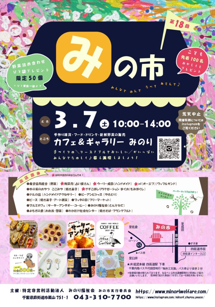 3月7日(土)、四街道市栗山にある「カフェ&ギャラリーみのり」で、「みの市」が開催されます。
