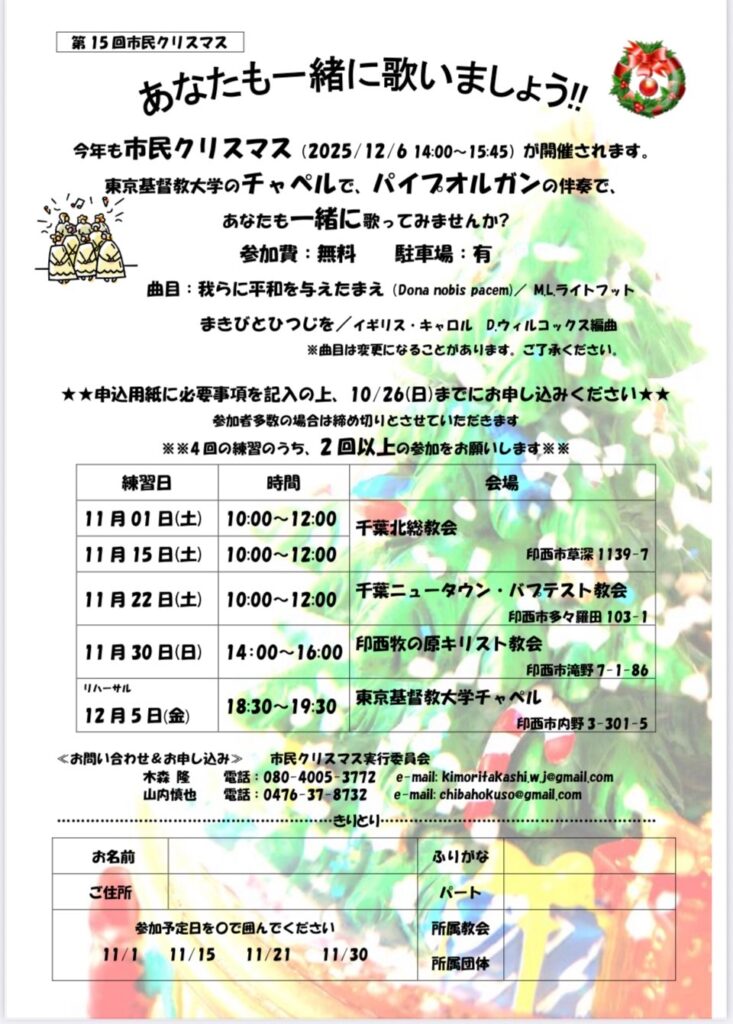 参加ご希望の方は、申込み用紙に必要事項を記入のうえ、10月26日(日)までに、第15回市民クリスマス実行委員会までお申込みください。