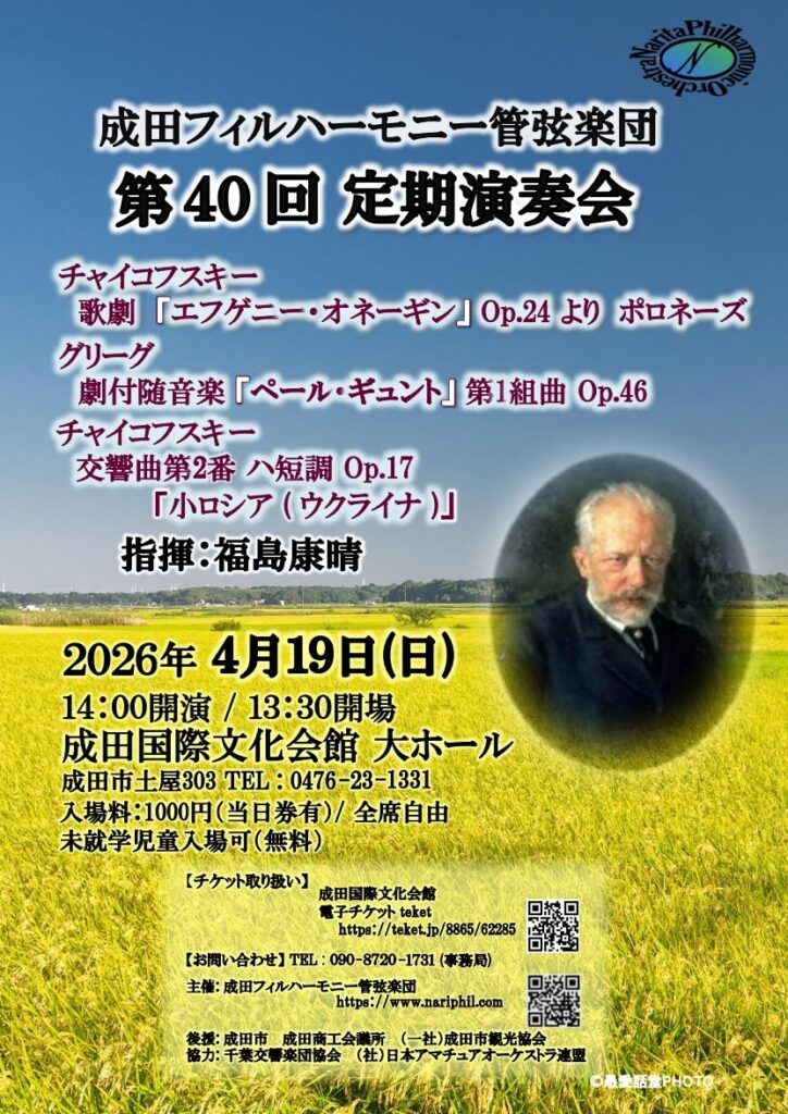 4月19日(日)、成田国際文化会館 大ホールで、成田フィルハーモニー管弦楽団による「第40回定期演奏会」が開催されます。