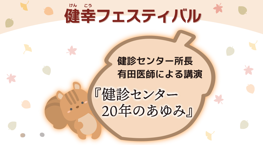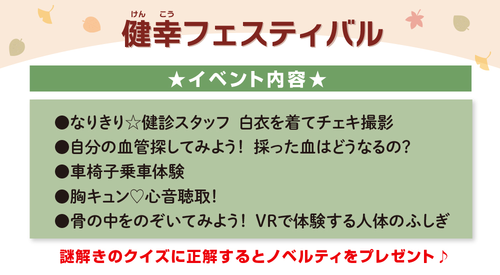 聖隷佐倉市民病院・健診センターは、おかげさまで開設20周年!これを記念して、11月22日(土)に「健幸フェスティバル~日頃の感謝を込めて~」を開催します。当日は健診センターの中を見学しながら健康について楽しく学べる内容が盛りだくさん。血管探しや血液検査の説明、心音を聴く体験、車椅子の乗車体験、さらにVRを使って骨の中をのぞく体験など、お子様から大人まで楽しめる企画をご用意しています。