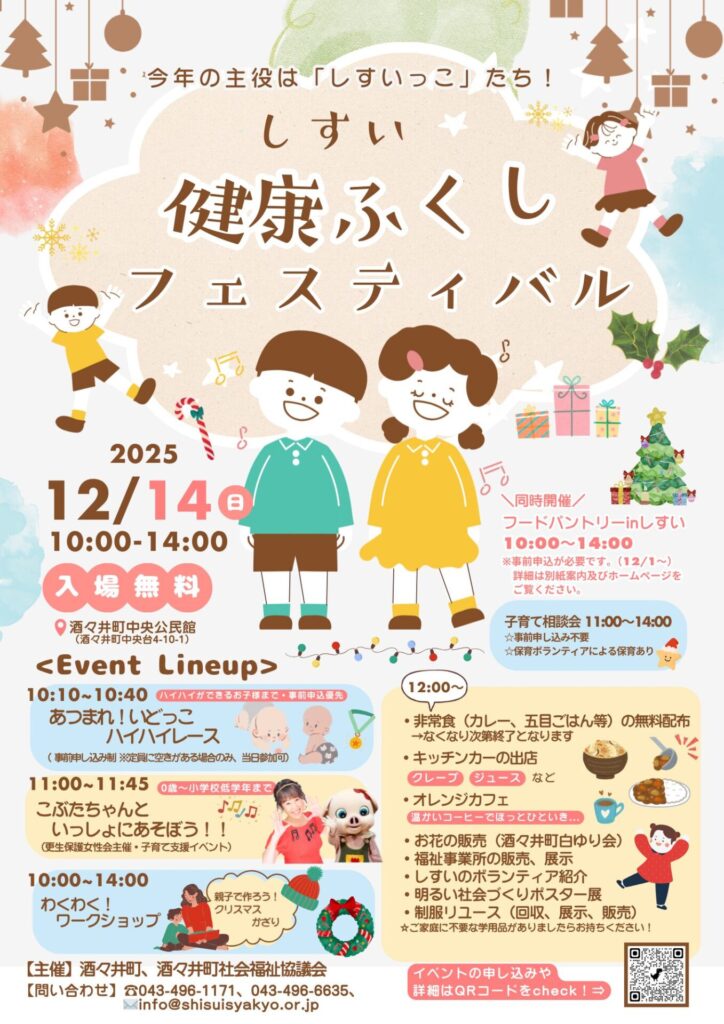 12月14日(日)、酒々井町中央公民館で「しすい健康ふくしフェスティバル」が開催されます。「今年の主役は「しすいっこ」たち!」をメインテーマに、子育て支援イベント「こぶたちゃんといっしょにあそうぼう!」や、親子でクリスマスグッズを作る「わくわく!ワークショップ」の開催など、親子向けのイベントが充実!そのほかにも、生後1歳程度まで参加できる「あつまれ!いどっこハイハイレース」や子育て相談会(11:00~14:00)、認知症について考えるカフェスペース「オレンジカフェ」、ボランティア団体の活動紹介、福祉事業所の作品展示販売、鉢花販売、非常食の配布など、健康・福祉に関する企画が満載です!