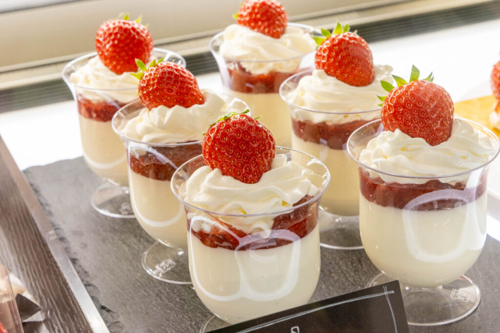 生クリーム100%の濃厚パンナコッタは、いちごジャムとの相性抜群!かための生地で食べ応えもあります。