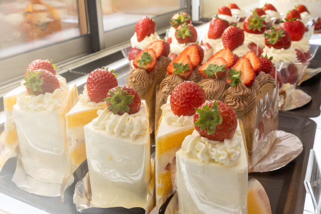 冬のフルーツの主役はいちご。ショートケーキを始め、タルトやロールケーキなど、いちごをふんだんに使用したスイーツがショーケースを華やかに彩ります。