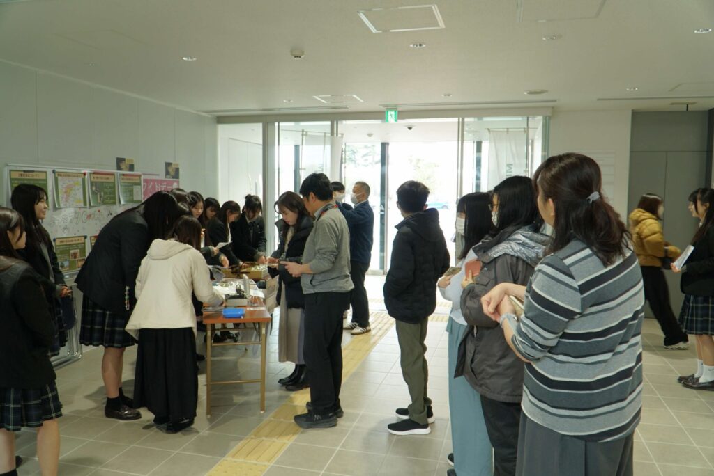 販売会では、生徒たち自らがPR。市役所を訪れる市民らが興味深そうに足を止めるなど、買い求める列ができました。