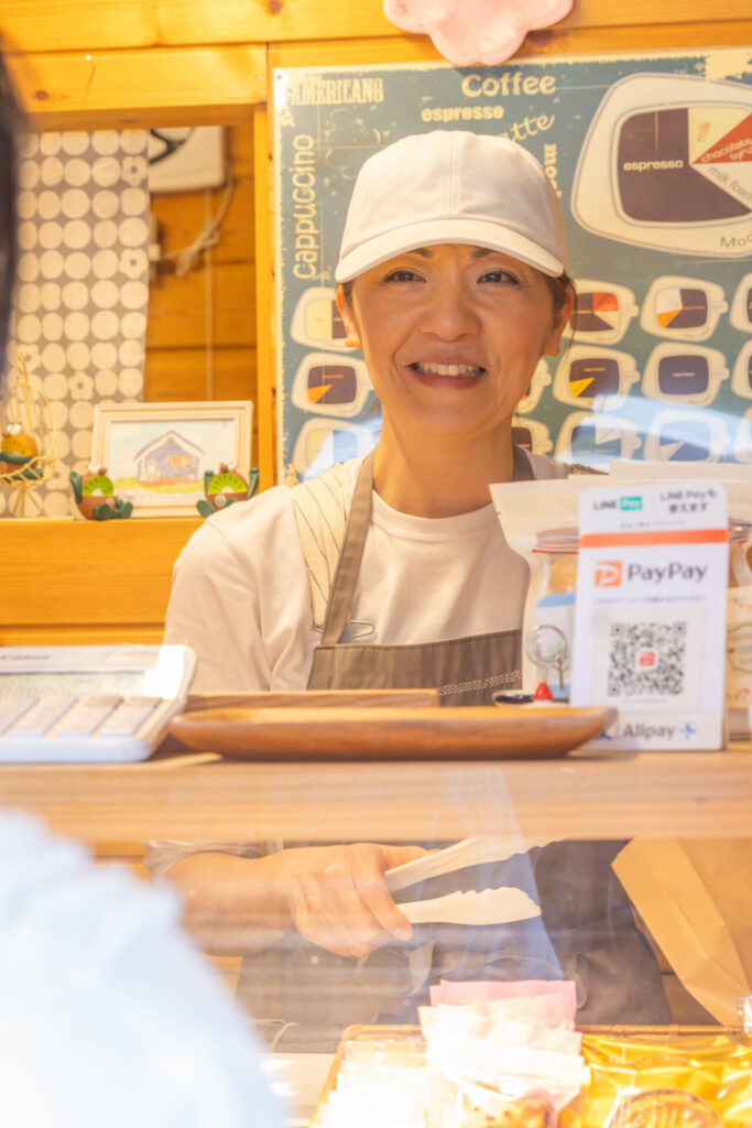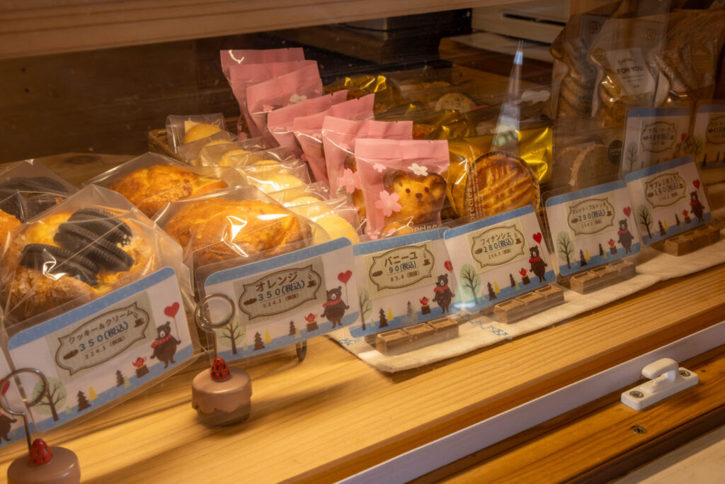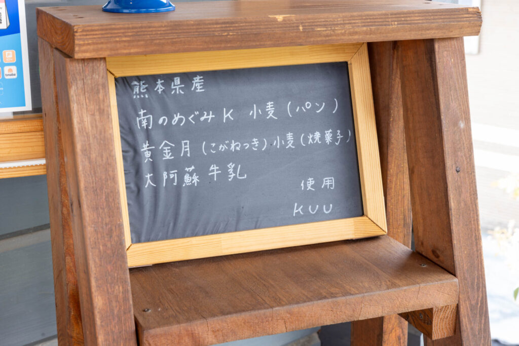 パンは、風味の良い熊本県産小麦、焼き菓子も熊本県産薄力粉で、どちらも阿蘇山麓のミルクを使用しています。コロナ禍での開業と一人での製造販売から、カウンター越しに注文を聞いて、品物をトレイに用意し、渡すスタイルです。