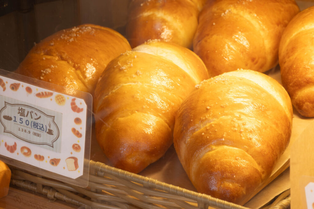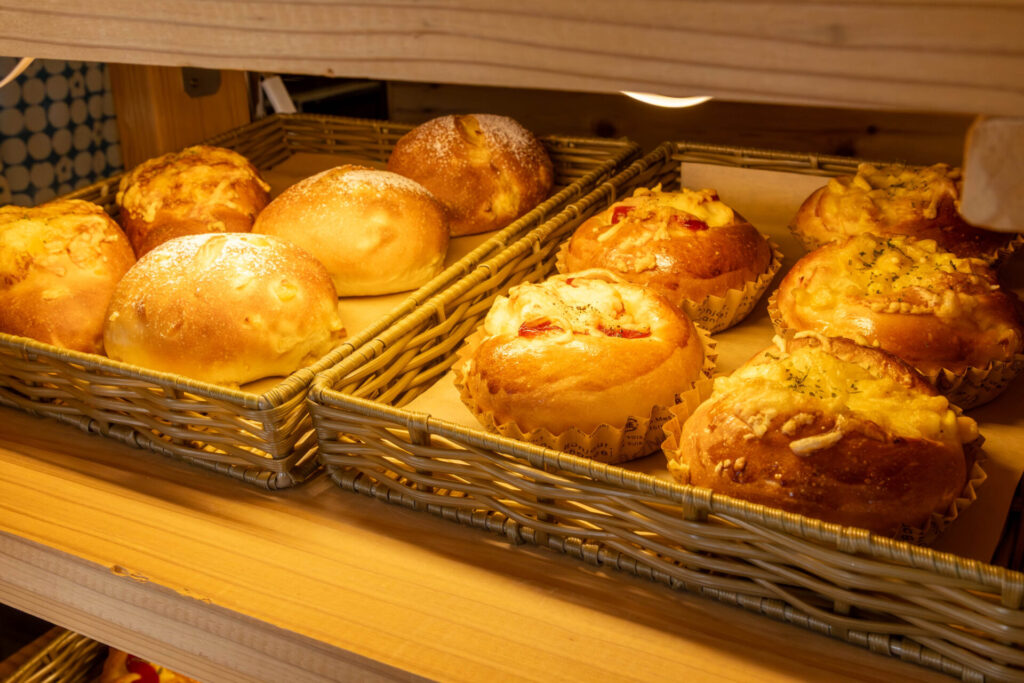 商品棚には、食パンや塩パン始め、コーンハムロール、ベーコンポテト、チキンごぼうなどの惣菜パンと、マフィン、フィナンシェ、クッキーなどの焼き菓子が種類豊富に並びます。
