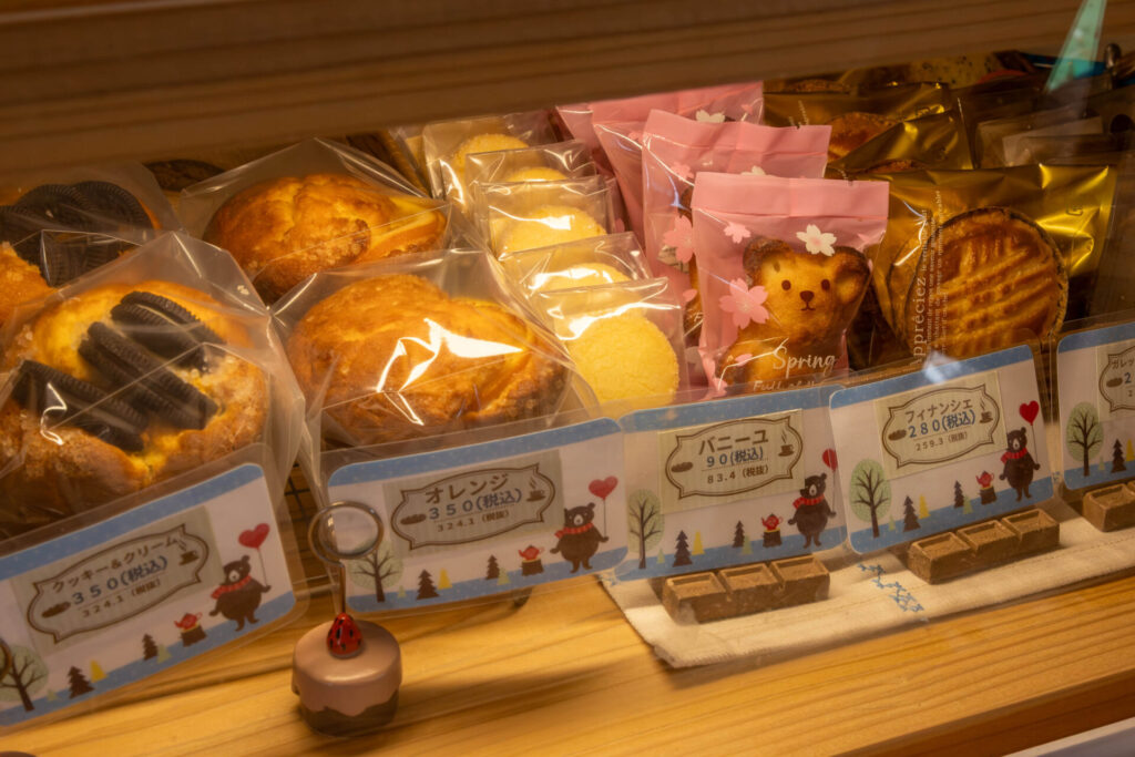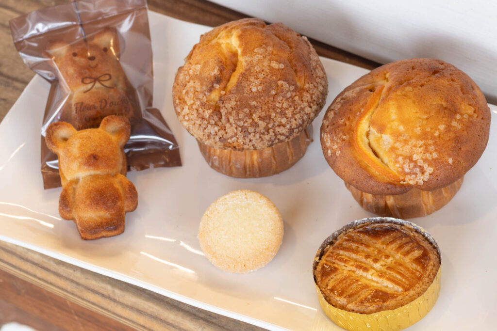 焼き菓子は、常時約7種類を販売。きのこ型の大きなマフィンを始め、フィナンシェやサブレ、ガレットなどが棚を賑わせます。