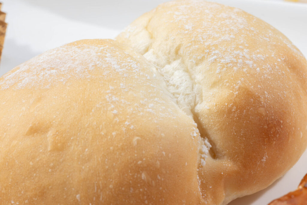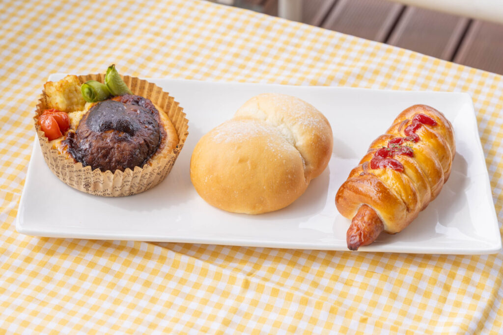 カウンターの窓越しには小さく映りますが、「KUU」のパンはひとつひとつボリュームがあり、惣菜パンでは主役の食材が一際、存在感を放ちます。お子様ランチをイメージした「チーズインハンバーグ」やホットドッグサイズのウインナーが贅沢に入った「フランクロール」など、見た目のインパクトはもちろん、大人も満足感を得られる食べ応えです。シンプルな「白パン」は、小麦とミルク、生クリームで構成されたもちもちふわふわの食感が特徴。ジャムや練乳、ハムやチーズを挟むなど、お好みでデザートにも、食事パンとしても味わえる万能型です。