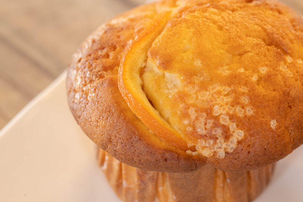 マフィンは数種類販売。「プレーン」は、朝食やおやつとしても人気です。初夏からお目見えする「オレンジマフィン」は、シロップ漬けされたスペイン産のオレンジスライスと生地には国産のブラッドオレンジピールが練り込まれており、柑橘の香りが爽やかさをもたらします。