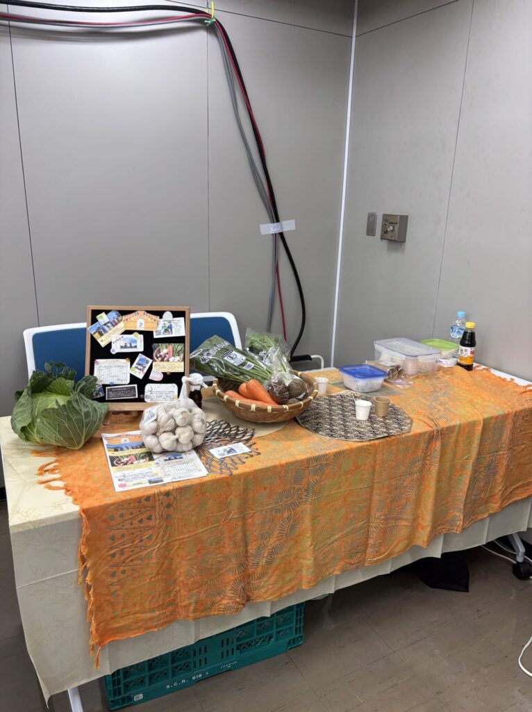 会場には、レタス・にら・青パパイヤ・有機にんにく・ごぼう・さつまいもなどの青果のほか、スープ、ワイン、たまご、鶏肉、冷凍餃子、そして私自身が出展した甘酒や米みそなど、多彩な商品がずらりと並びました。