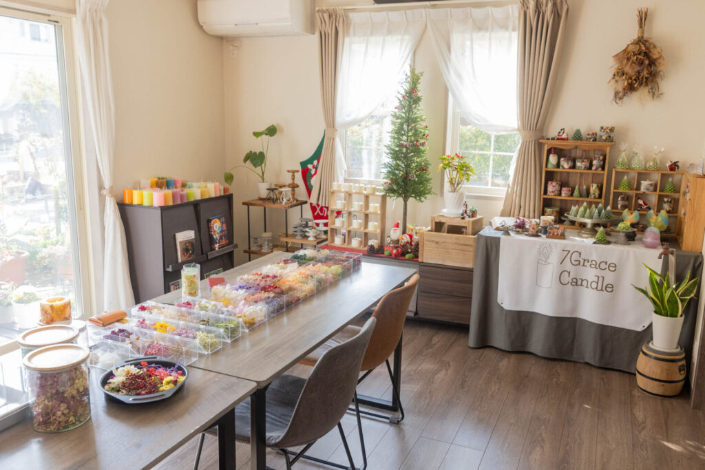 四街道市もねの里にある「7Grace Candle(セブングレイスキャンドル)」は、キャンドル作家の柿崎奈々さんが自宅のリビングをアトリエにワークショップの開催や県内外のイベント出店、SNSでの受注などを通して、ボタニカルキャンドルの制作と販売を行っています。